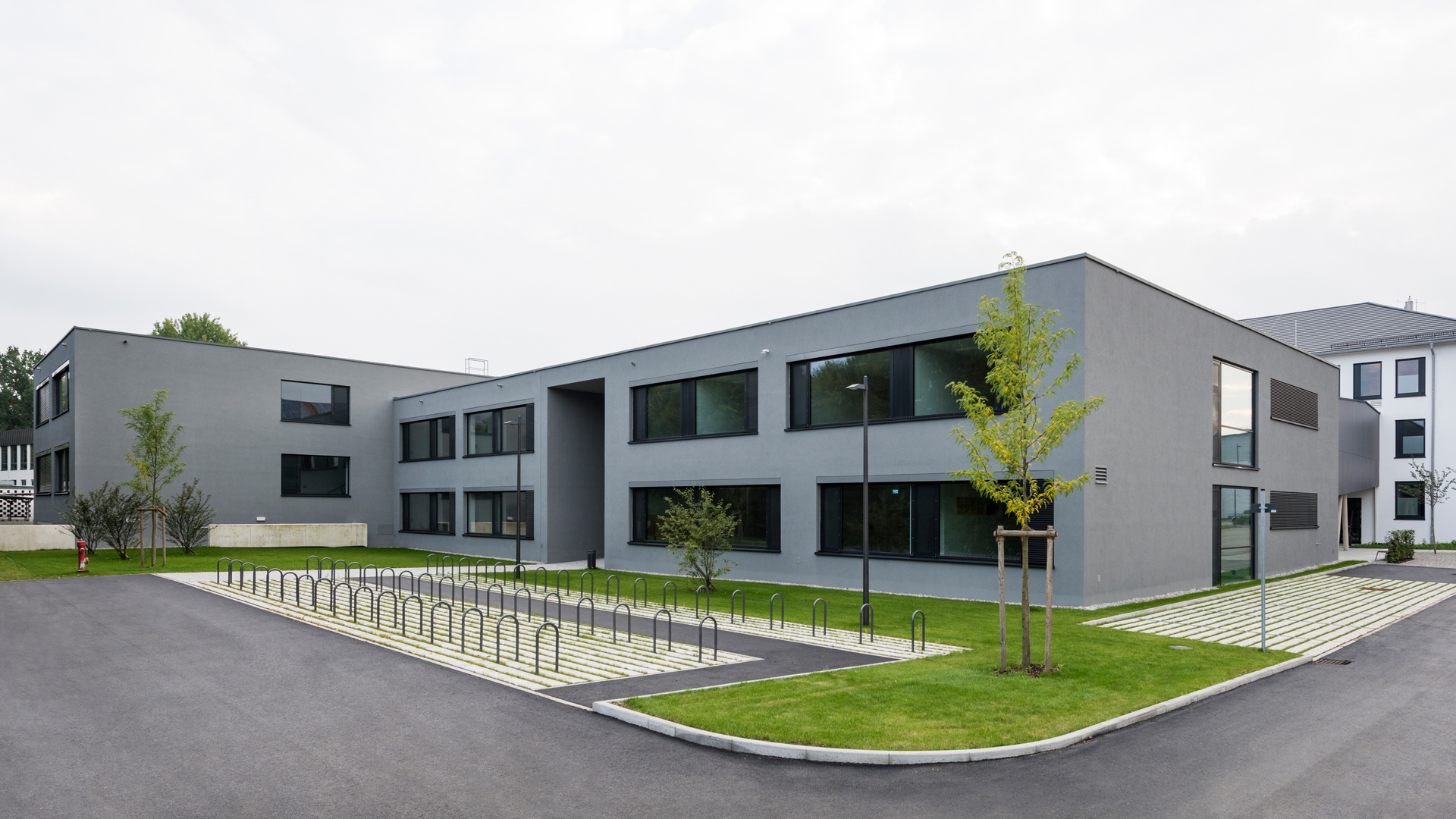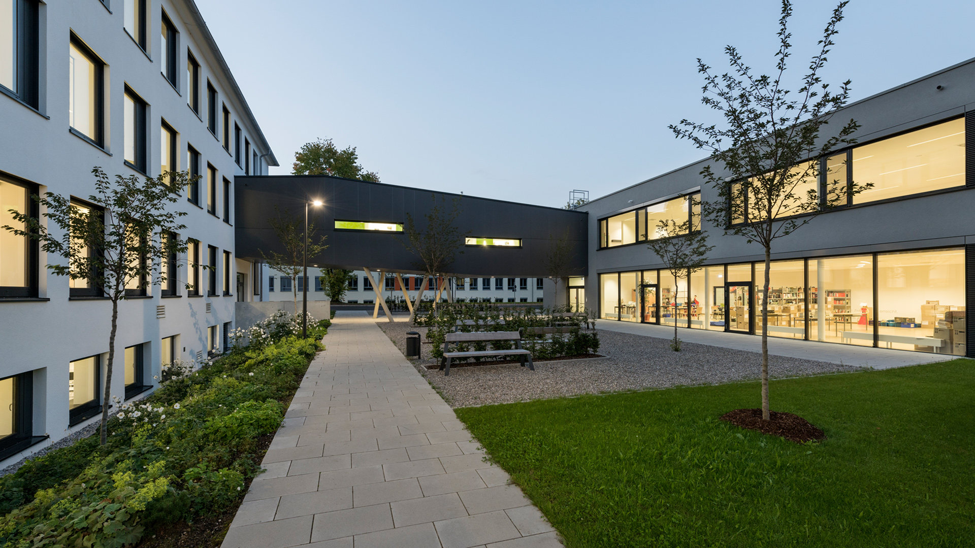 Die kleinteilige Struktur wird durch den Neubau gestärkt und bildet mit dem Atriumbau ein in seinen Proportionen ausgewogenes Ensemble. Über einen Verbindungssteg wird der neue und auch der bestehende Erweiterungsbau barrierefrei an den Atriumbau angebunden. Die Glasfassade der Pausenhalle öffnet sich zum Innenhof und bildet mit diesem einen Einheit. Die Blickbeziehungen der kommunizierenden Flure im Atriumbau bleiben durch die zweigeschossige Pausenhalle erhalten.
