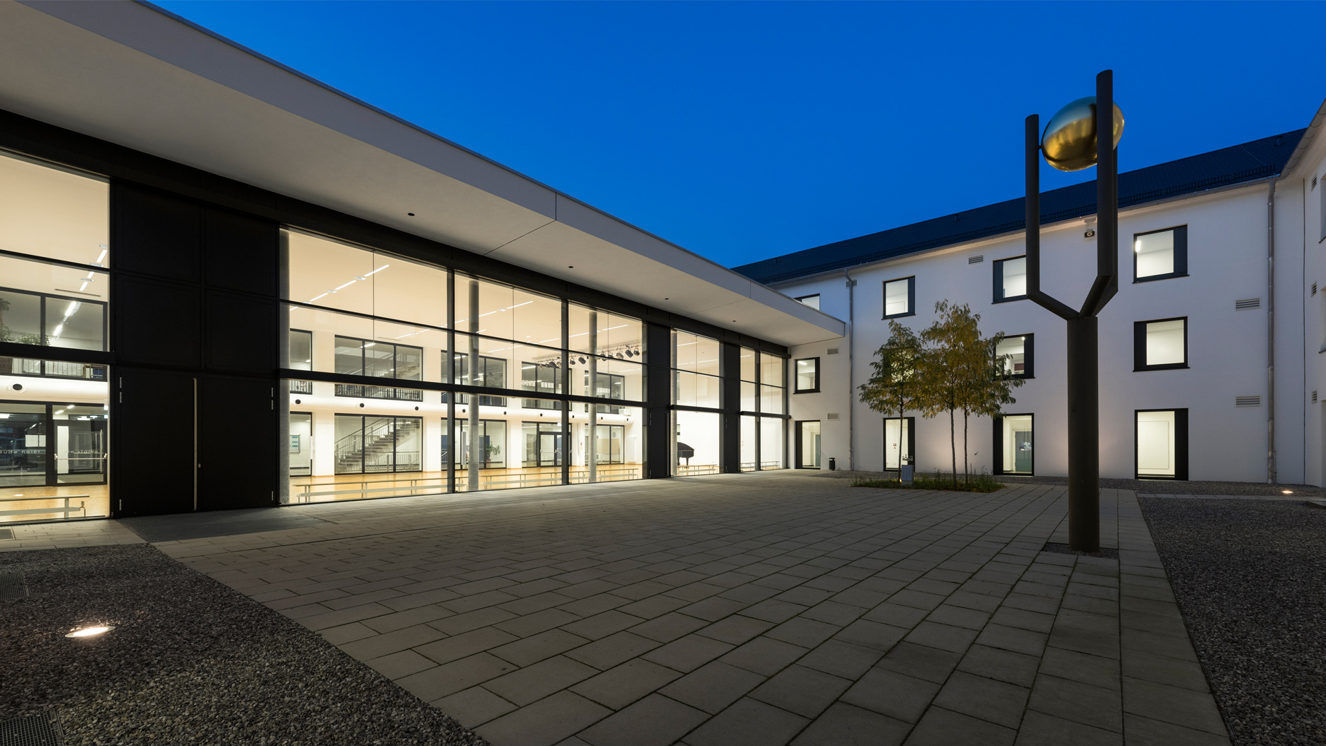 Die kleinteilige Struktur wird durch den Neubau gestärkt und bildet mit dem Atriumbau ein in seinen Proportionen ausgewogenes Ensemble. Über einen Verbindungssteg wird der neue und auch der bestehende Erweiterungsbau barrierefrei an den Atriumbau angebunden. Die Glasfassade der Pausenhalle öffnet sich zum Innenhof und bildet mit diesem einen Einheit. Die Blickbeziehungen der kommunizierenden Flure im Atriumbau bleiben durch die zweigeschossige Pausenhalle erhalten.