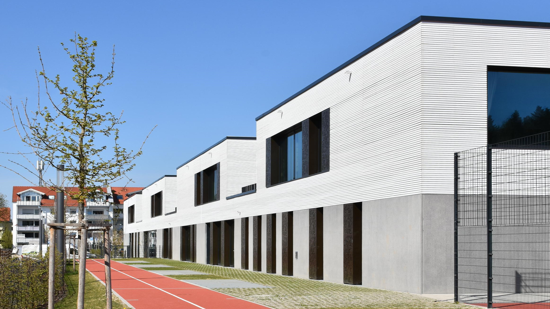 Der ruhige, lineare, zweigeschossige Neubau der Schule wirkt ordnend auf das heterogene städtebauliche Umfeld. Hinsichtlich Höhenentwicklung und Proportion reagiert die Schule auf die unmittelbar im Westen angrenzende Wohnbebauung. Die Körnung der ``Cluster`` vermittelt hierbei zwischen der kleinteiligen Wohnstruktur und dem eher städtischen Kontext an der Rathausstraße. Die ``eingeschossige`` Sporthalle markiert den Eingang der Schule, zwischen Rathaus und Halle, ohne dem Verwaltungssitz seine Bedeutung zu nehmen. Die Fuge zwischen Sporthalle und Schule ermöglicht sowohl von der Rathaus - als auch von der Poststraße aus die direkte Zuwegung beider Einrichtungen. Bedingt durch die 1- bzw. 2- geschossige Bauweise von Sporthalle und Schule ist eine optimale Belichtung aller Gebäude gegeben.